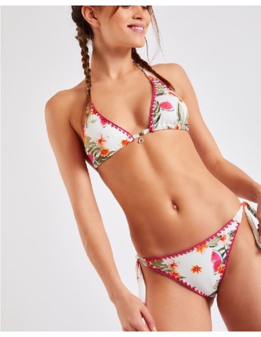 Parte de abajo de bikini de color crudo con con estampado de flores con Pespuntes que contrastan de "punto concha" rosa fucsia.