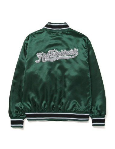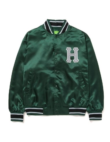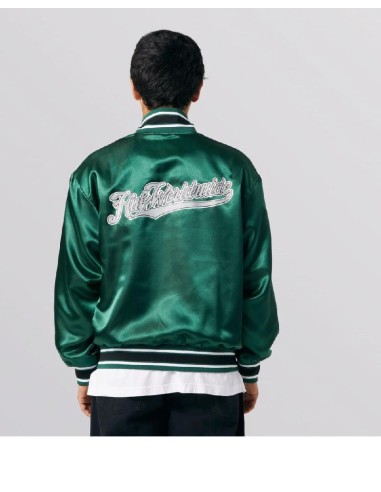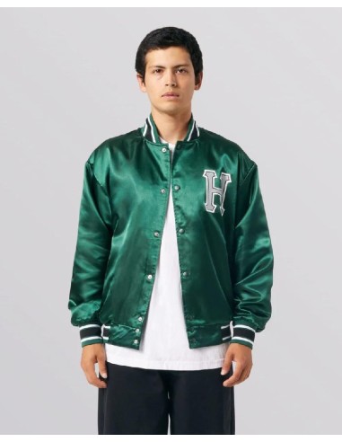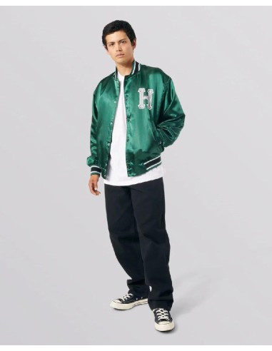 La chaqueta de la colección"HUF´s 20th Anniversary" se inspiran del béisbol vintage, está hecha de satén suave y tiene botones en la parte delantera.