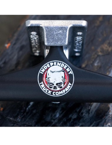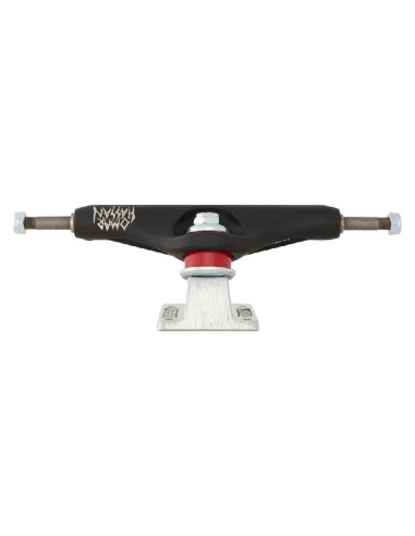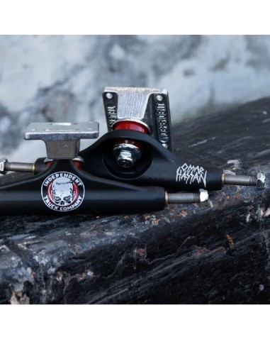 Ejes Independent Stage 11 Hollow Omar Hassan Pro con arte gráfico de John Lucero en una percha negra plana con el logotipo impreso y grabado con láser de Omar Hassan. Placa base plateada pulida, cojines rojos y herrajes plateados.