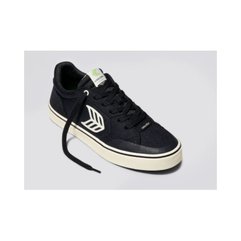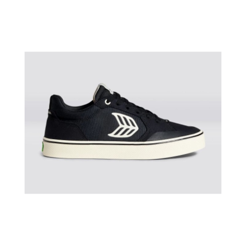 Zapatillas para Skateboarding de color negro vulcanizadas hechas a mano, de la marca americana CARIUMA, modelo “Mike Valelly”. Zapatillas para skate que destacan con la durabilidad, movimiento y el agarre a la tabla. La parte superior de la zapatilla esta cubierta con lona de algodón orgánico y gamuza de primera calidad con triple puntada. La suela fabricada de 100 % caucho natural antideslizante y la plantilla hecha de aceite de Mamona, inserto de corcho de base biológica con el logotipo de CARIUMA. Cordones fabricados con plásticos reciclados y herretes de metal grabado.