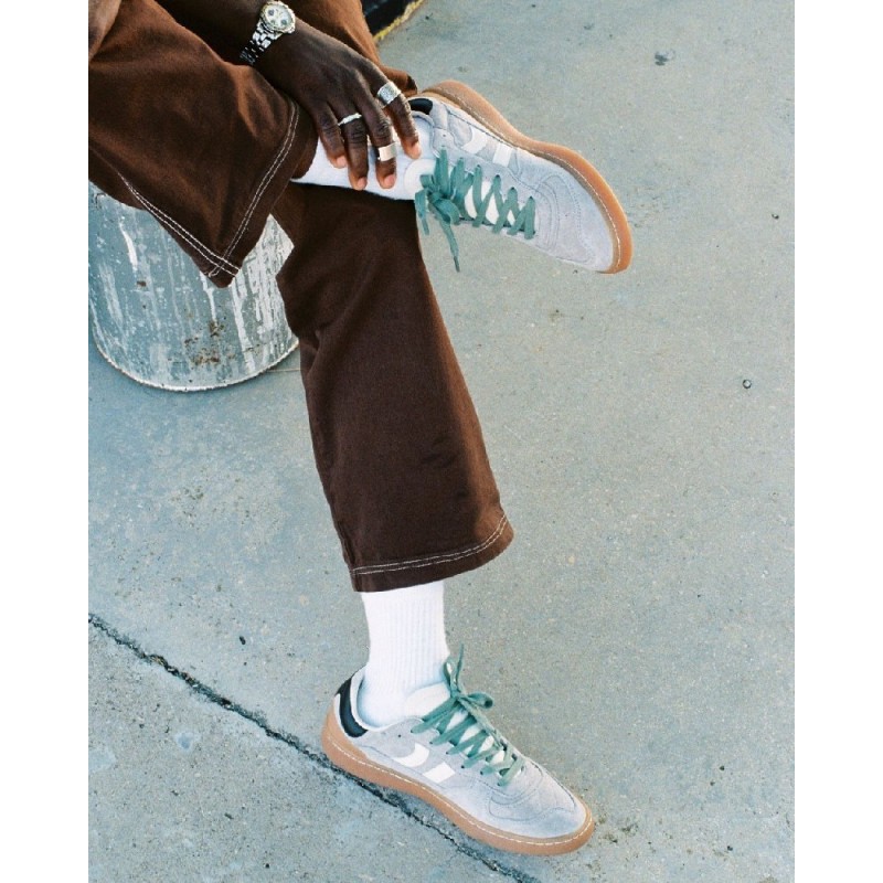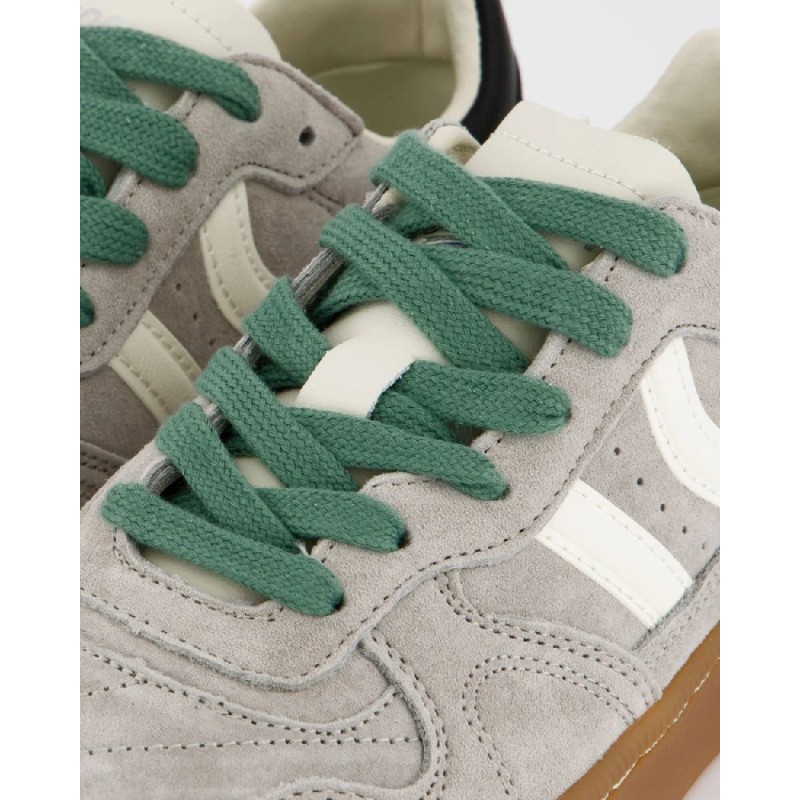 Zapatilla deportiva de serraje con detalles en contraste de color. Lengüeta de piel y preformada con un acolchado figurado. Vistas del forro en piel. Cordones planos de algodón en dos tonos intercambiables. Cuello ligeramente acolchado. La parte delantera lleva un refuerzo de pespuntes. Suela flexible de goma/caucho que aporta durabilidad y agarre. Cuenta con el nombre del modelo “GOAL” en lateral en oro viejo