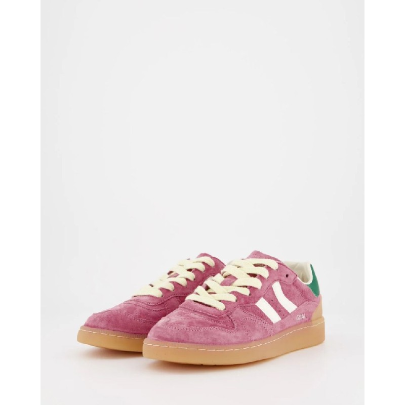 Zapatilla deportiva de serraje con detalles en contraste de color. Lengüeta de piel y preformada con un acolchado figurado. Vistas del forro en piel. Cordones planos de algodón en dos tonos intercambiables. Cuello ligeramente acolchado. La parte delantera lleva un refuerzo de pespuntes. Suela flexible de goma/caucho que aporta durabilidad y agarre. Cuenta con el nombre del modelo “GOAL” en lateral en oro viejo.