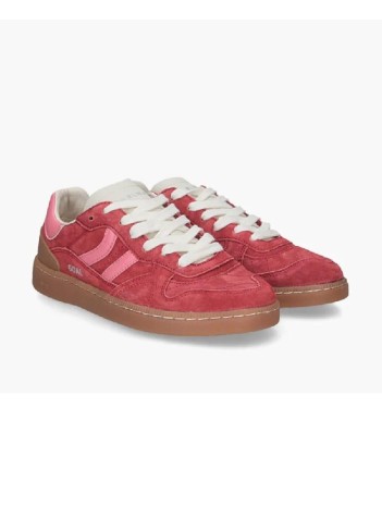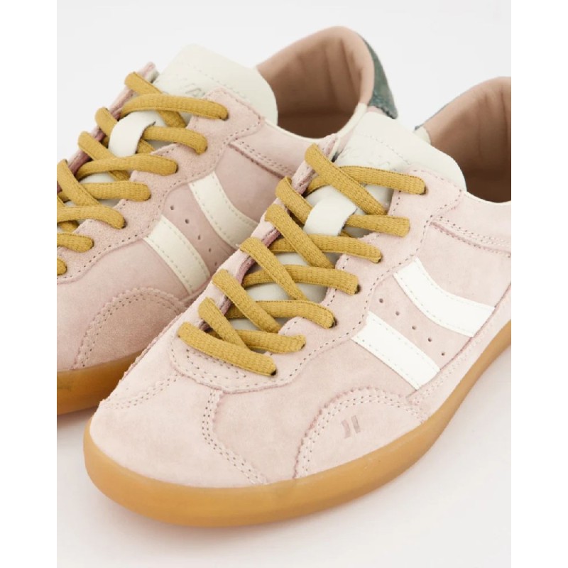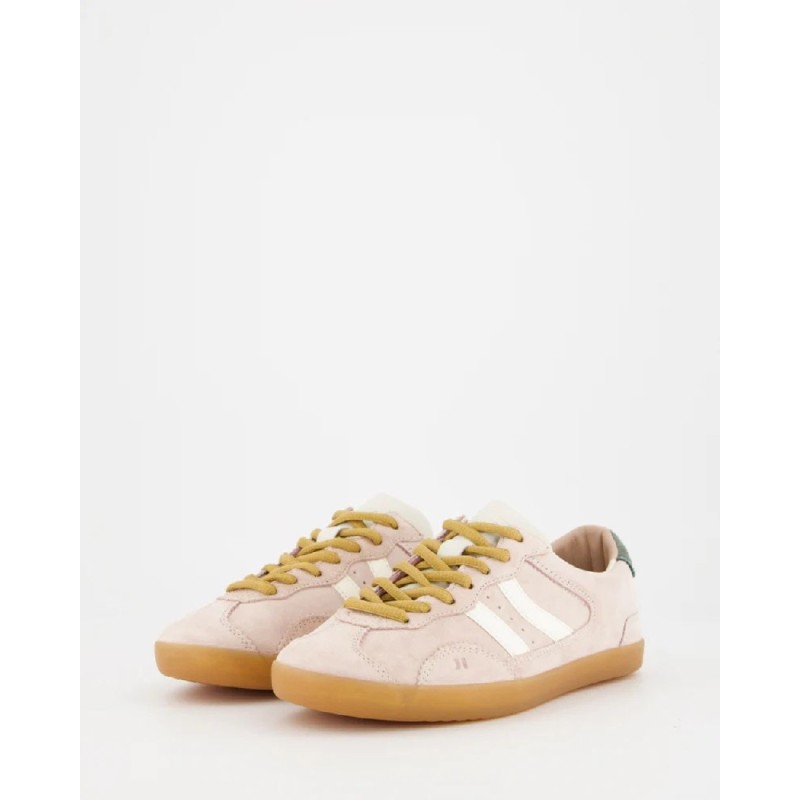Zapatillas deportivas bajas de piel tipo serraje. Corte sencillo y clásico con cierre de cordones. La pieza de talón y el logo contrastan tanto por color como por textura. La plantilla de foam acolchada lleva impreso un diseño multilogo. El forro de piel contrasta en la parte trasera siguiendo el tono del corte. La suela de goma ligera en colores miel lleva un pespunte en la base que refuerza la unión entre el corte y la misma suela.